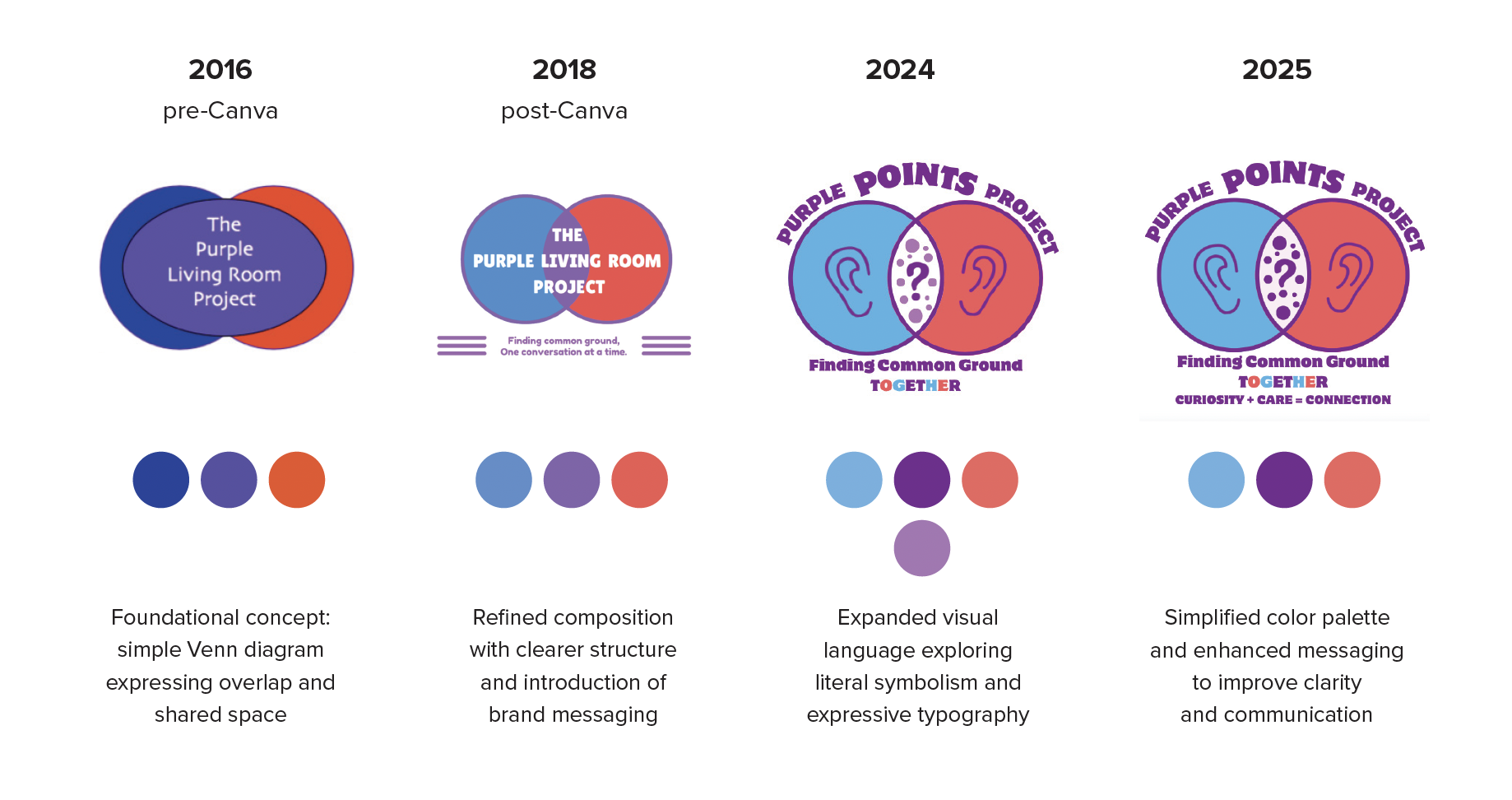 Over time, the identity evolved from a simple Venn diagram expressing shared space into a more refined and intentional system. Early iterations introduced structure and messaging, while later explorations incorporated more literal symbols of listening and dialogue.